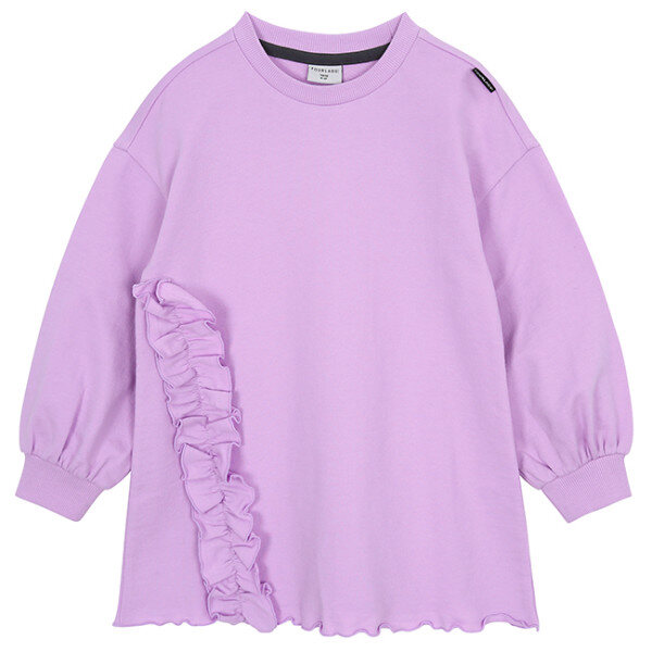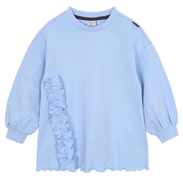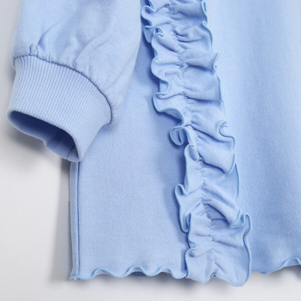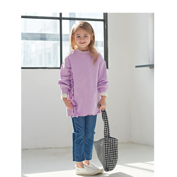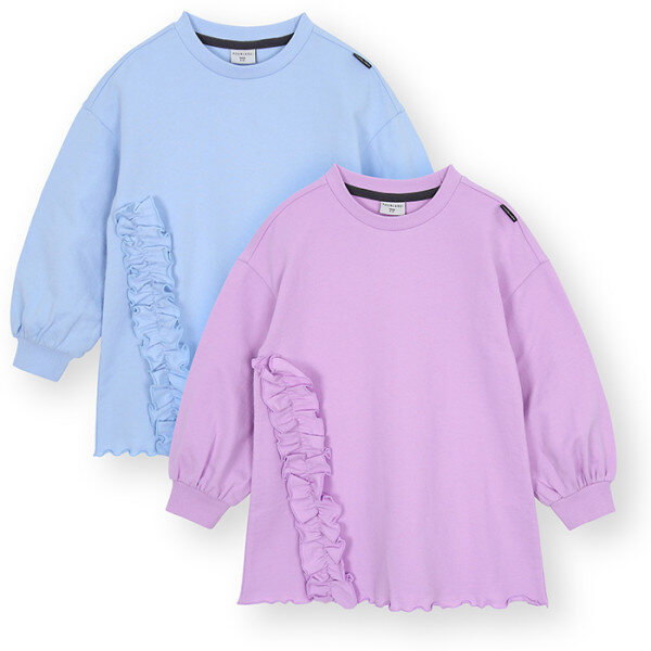 소프트한 컬러감의 장식 프릴 , 밑단의 꼬불거리는 느낌이너무 귀여운 롱 티셔츠에요.엉덩이를 덮는 기장감으로 레깅스나 청바지와 편안하게매치하기 좋은 데일리아이템 이랍니다