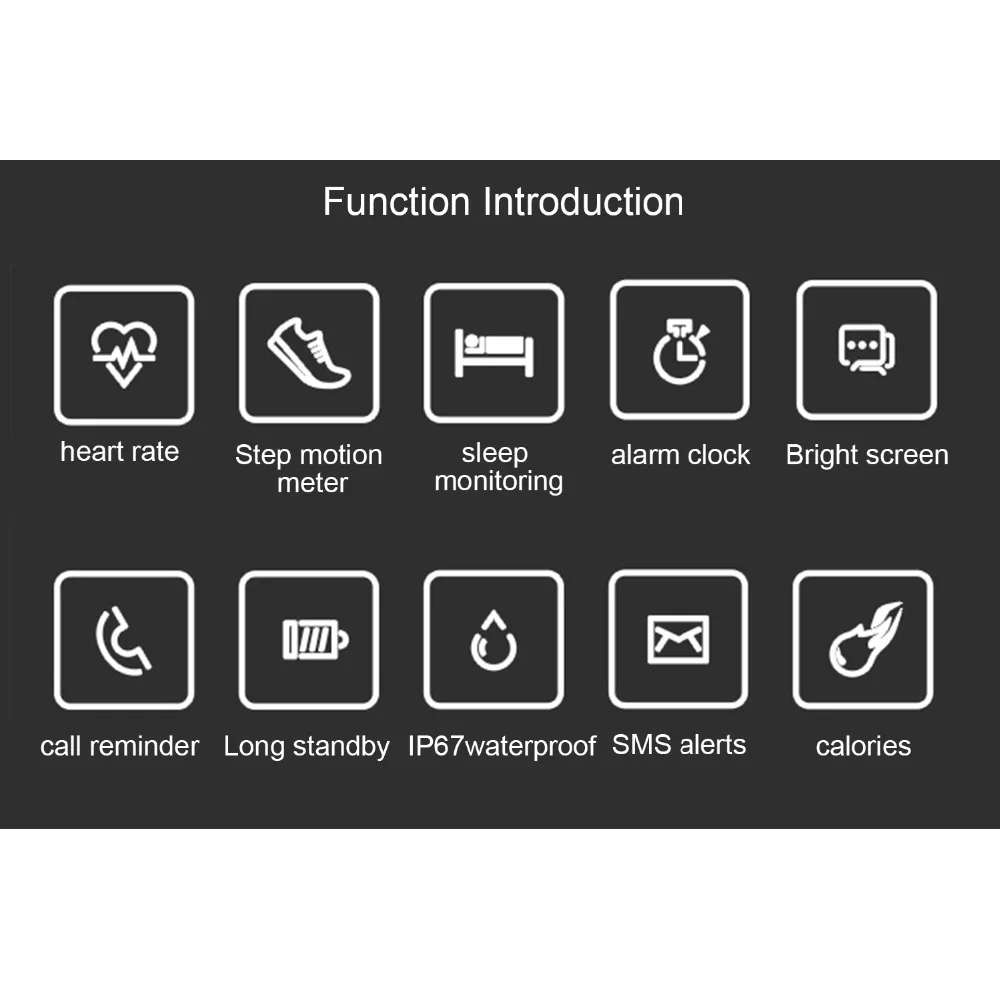 Function:Passometer,Sleep Tracker,Heart Rate Tracker,Alarm Clock,Remote Control,Activity Tracker,Fitness Tracker,Social Media Notifications,Message Reminder,Call Reminder