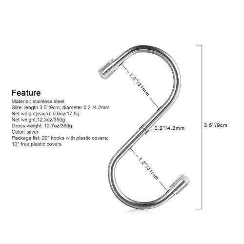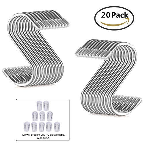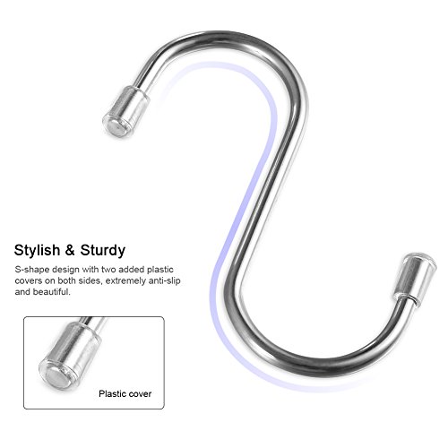 TOOLTOO Anti-corrosion S-shaped Hooks Heavy-duty Hanging Hooks Multi-functional Hooks Hangers for Kitchen, Bathroom, Bedroom and Office, Silver, 20 Pieces, 10 Free Plastic Covers
