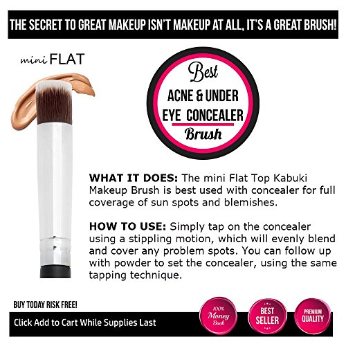 UNIQUE VERSATILITY – Sun Spots, Blemishes, Small Imperfections? The mini Flat works great with liquid concealer because the brush is so dense; the liquid goes on your face and not into the bristles. The flat top gives all over, even coverage. The small bristle head is perfect for the hard to reach, yet delicate areas of the face, such as around the eyes, nose and mouth. Get fantastic coverage and touch up perfection every time.