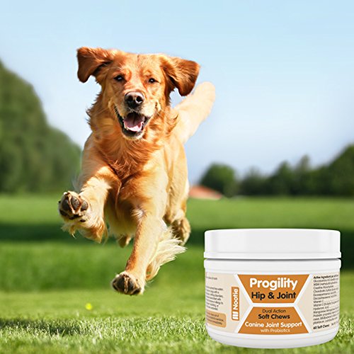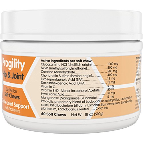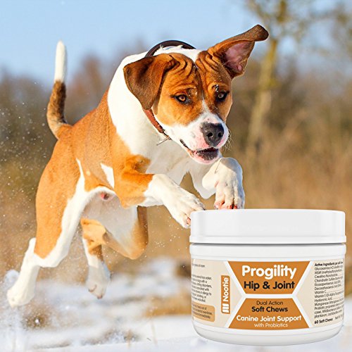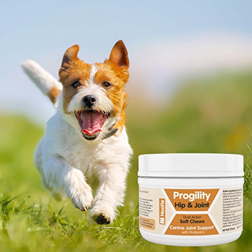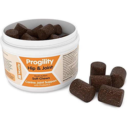 -. Binding : Misc. -. Brand : Nootie -. Feature : ● AN ENTIRE DAY'S DOSE IN ONE SOFT CHEW: Dogs up to 90 lbs. get everything they need in one tasty chewable treat. Probiotics help dogs fully absorb the nutrients while supporting their immune health. / ● THE ONLY JOINT SUPPLEMENT CONTAINING HYALURONIC ACID: Glucosamine and Chondroitin are now combined with the powerful hip and joint lubricating and cushioning effect of Hyaluronic Acid. / ● DOGS LOVE THE TASTE OF PROGILITY CHEWS: Helping your dog take their medication is easy when it tastes this good. So yummy, they'll never know it's healthy and nutritional. / ● HELPS SENIOR DOGS REGAIN THEIR VIGOR: Concentrated doses of all the super stars of joint health and joint pain relief are right here: Glucosamine, Chondroitin, MSM, Vitamin C and now Hyaluronic Acid. / ● COMES WITH A 100% SATISFACTION LIFETIME GUARANTEE: No need to take risks with your dog's health - we will give you your money back if you don't see improvement in your pet's joint health. -. Label : Nootie -. Manufacturer : Nootie -. NumberOfItems : 20 -. PackageQuantity : 60 -. ProductGroup : Pet Products -. ProductTypeName : PET_SUPPLIES -. Publisher : Nootie -. Studio : Nootie -. Title : Progility Chewable Hip and Joint Supplement for Dogs - Probiotics - Helps Relieve Joint Pain and Restore Flexibility - Glucosamine - Chondroitin - MSM - Hyaluronic Acid - Vitamin C - Fully Absorbable