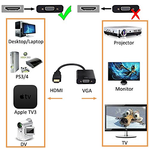 This lightweight and portable connect Laptop/Desktop/PS3/4/ Xbox/Blu-ray player/Apple TV with HDMI port equipped to monitor/TV/projector with VGA port; A VGA cable (not included) is required to function