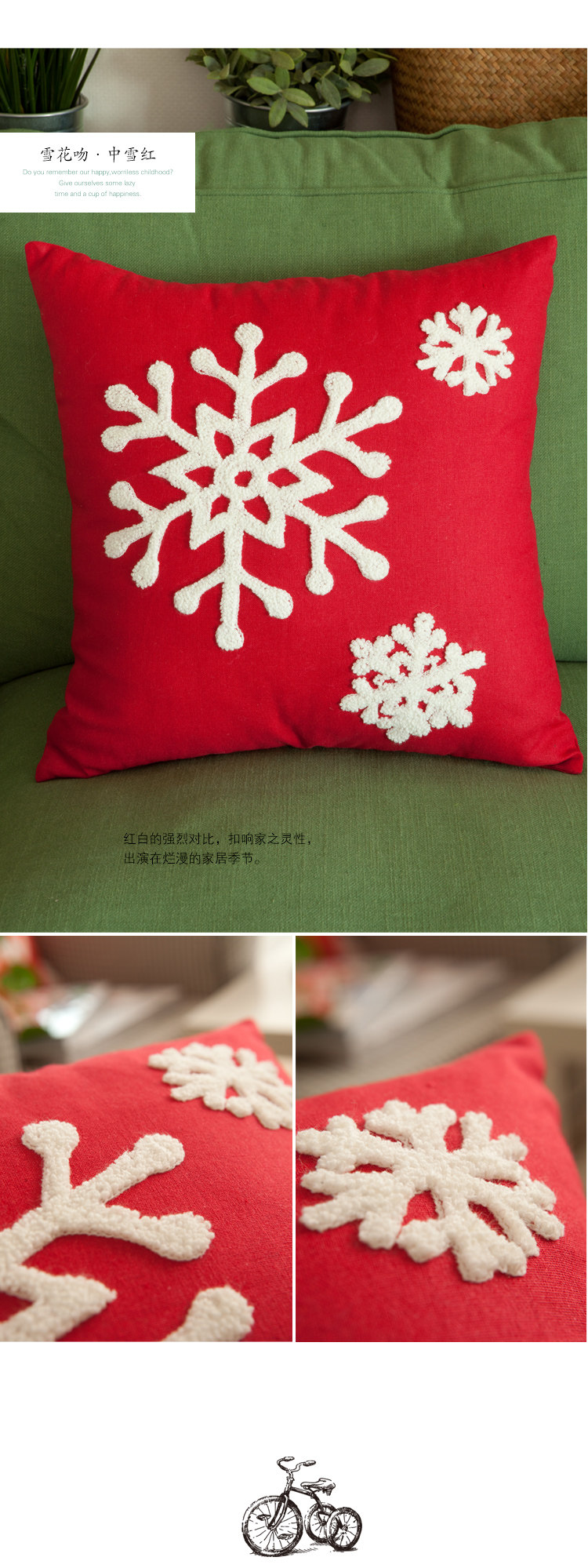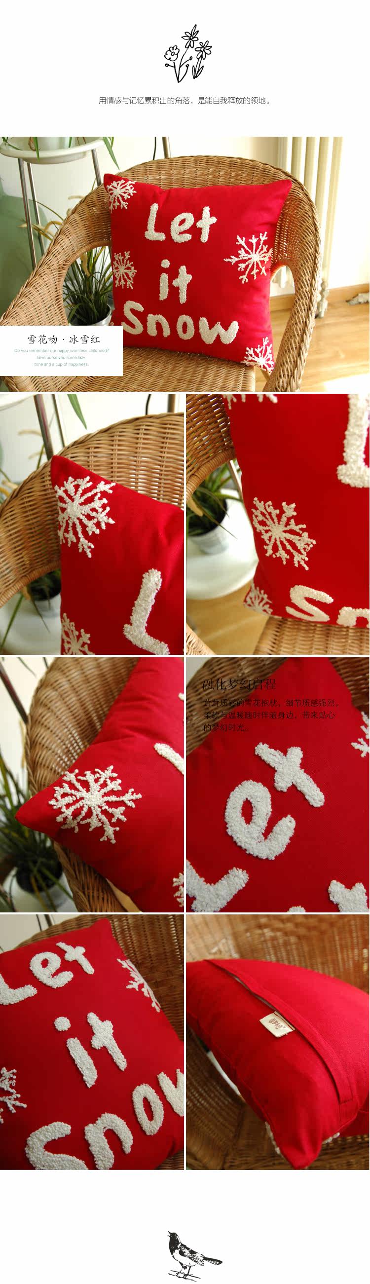 雪花吻&抱枕套 45cm*45cm 中国红 89%棉+5%涤+6%麻 手工毛线刺绣