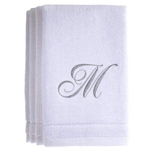 Monogrammed Towels Fingertip, Personalized Gift, 11 x 18 Inches - Set of 4- Silver Embroidered Towel - Extra Absorbent 100% Cotton- Soft Velour Finish - For Bathroom/ Kitchen/ Spa- Initial M (White)