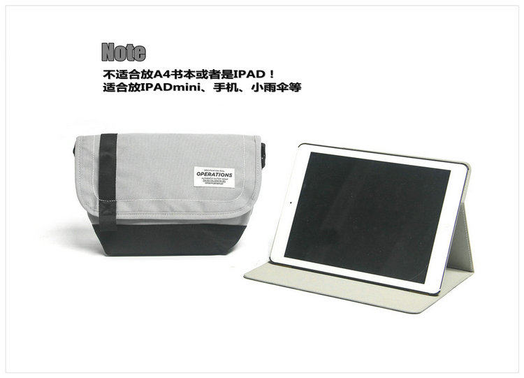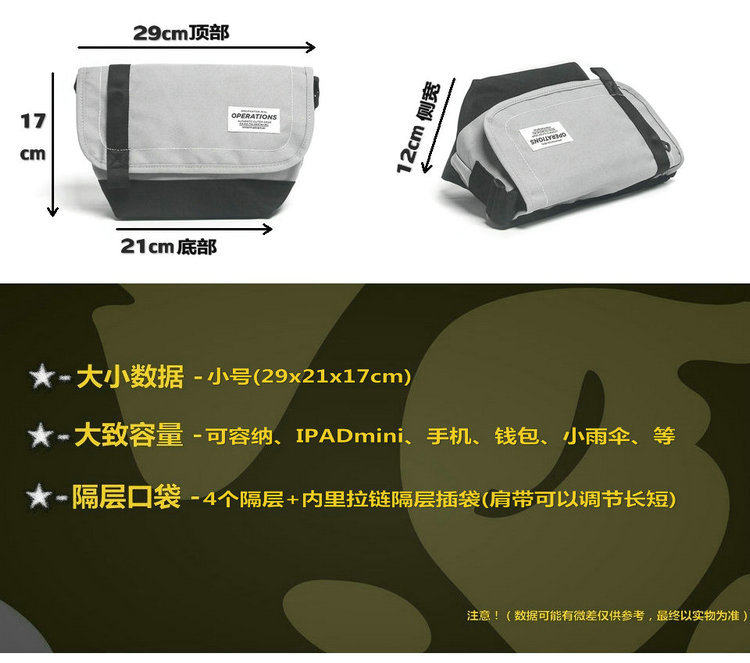 款式材料:包包属于小号邮差包款,轻便扎实,材料采用优质尼龙布艺制成,耐用耐看! 容量隔层:包包属于小号款,适合日常休闲实用,适合放IPAD迷你+手机+小雨伞+随身物品! 卖家试用:包包不大,日常逛街+骑行运动都是不错选择,撞色拼色设计让包包简约不简单!