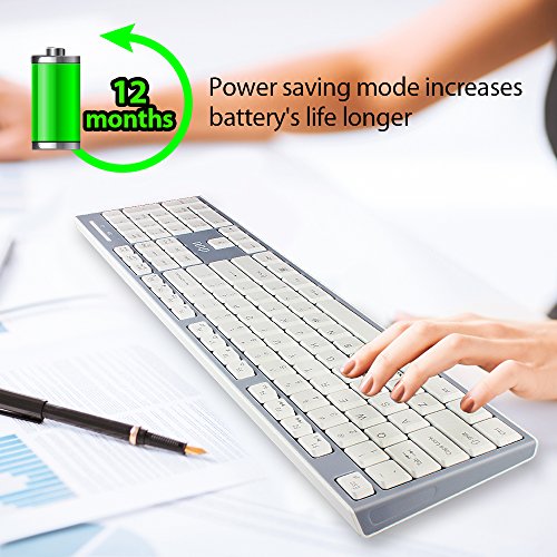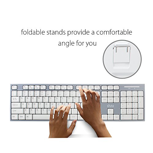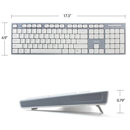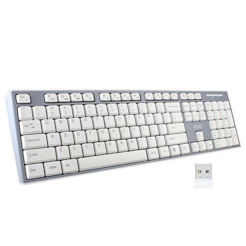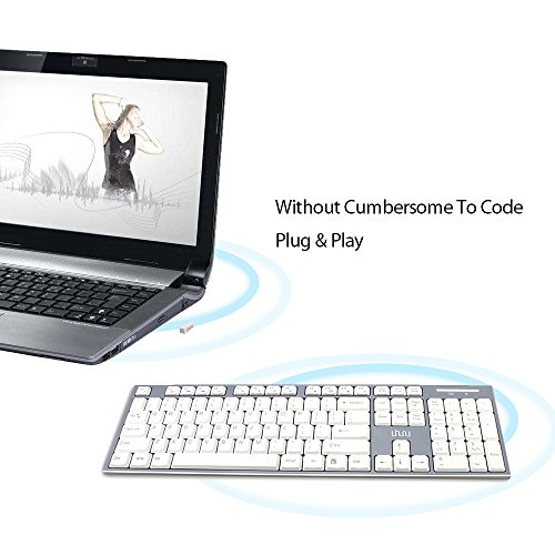 The UHURU 2.4G Compact Wireless Keyboard is the latest improved version. It adopts fashionable, elegant design and smooth figure, making you feel good. Butterfly structure keys with soft-touch enables more comfortable typing experience. Delicate appearance, comfortable hand feeling, reliable connection, give you best usage experience.RELIABLE CONNECTION·Perfect compatible with Windows 10 / 8 / 7 / Vista / XP/ IOS/ MAC. ·Without any driver, just plug the Nano-receiver into the USB interface of computer, it works. ·MULTIMEDIA HOTKEYSKeyboard come with 13 hot keys, help you save time and effort.·You can easily realize the multimedia work through this keyboard press together FN with hot key.·The shortcut buttons perform the following functions: volume +/-, next / previous track, next / previous page, search, home page, bookmarks, mute, play / pause, etc.FULL SIZE KEYBOARD Soft touch and compact keys are very comfortable and sensitive to type. It can prevent some occupational diseases like keyboard hand from happening.Feature