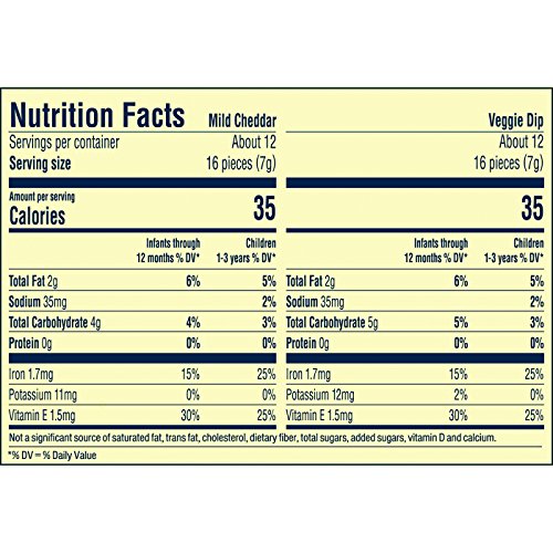 -. Binding : Grocery -. Brand : Gerber Graduates -. EAN : 0015000937997 -. Feature : Pack of four (4) 1.48 oz containers; Includes 2 Mild Cheddar and 2 Veggie Dip / Mel table texture that's easy to chew and swallow and a size just right for cute little fingers / Non-GMO: Not made with genetically engineered ingredients / 2g of whole grain per serving and a yummy taste they love / Gerber is a leader in infant and early childhood nutrition. -. Label : Gerber -. Manufacturer : Gerber -. MPN : 43220-19136 -. NumberOfItems : 1 -. PackageQuantity : 1 -. PartNumber : 43220-19136 -. ProductGroup : Grocery -. ProductTypeName : GROCERY -. PublicationDate : 2017-01-11 -. Publisher : Gerber -. ReleaseDate : 2017-01-11 -. Size : 5.92 Ounce -. Studio : Gerber -. Title : Gerber Graduates Lil Crunchies, Cheddar and Veggie Dip, 1.48 Ounce, 4 Count -. UPC : 015000937997
