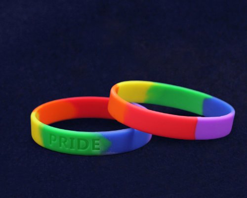 These rainbow silicone bracelets are made of high quality 100% silicone that you can see and feel. The bracelets are embossed with the word PRIDE and are approximately 8 inches. This is a wholesale pack that contains 50 bracelets in a bag.