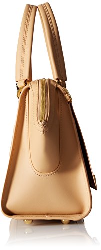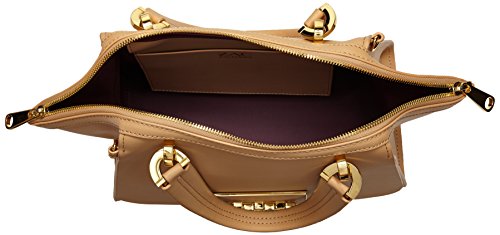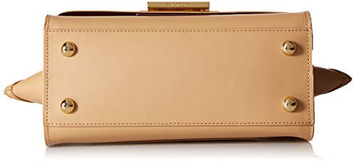 Structured leather satchel featuring twin top handles, gusseted side panels, and protective feet