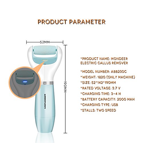 Studio : Aboel Publisher : Aboel Binding : Misc. Product Description Product description: Our product is put on market in 2017 and helps users enjoying the joy of pedicure. It can effectively remove your callus couped with its safe blu-ray disinfection, reshaping your feet and making them tender, smooth. Model:ABB230C(electric) Dimension: ABS TPR Net weight: 182g Suitable People: Not for special groups (people with skin allergy, mental patient,children etc.) Accessories: 1 * callus remover, 1 * massage roller, 1 *rough grinding roller, 1 *fine grinding roller, 1* USB cable, 1* foot file, 1* blue light Extra Accessory description: Blue Light: Under the roller is the blue light which can switch on automatically once the device starts, sterilizing user's foot and meeting diversified needs. Double-sided Foot File: One side, metal surface, another side, matte finish, meet different needs, mannual operation, also convenient for users.