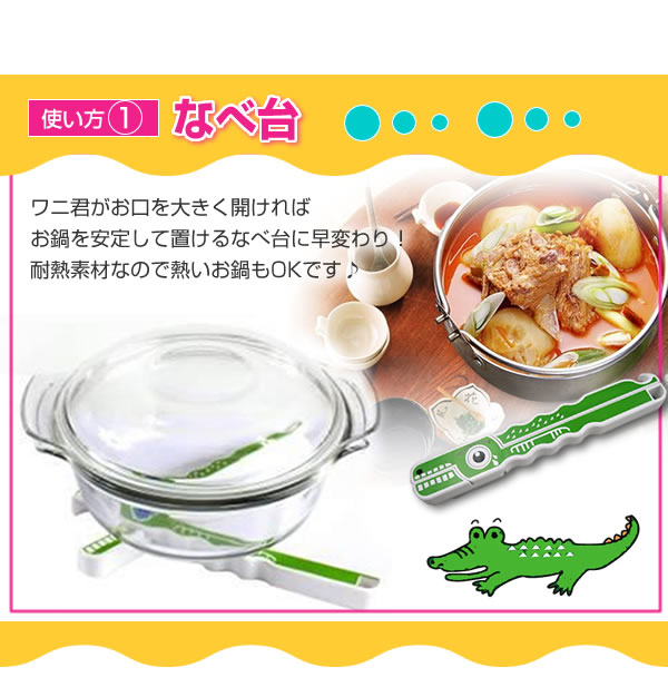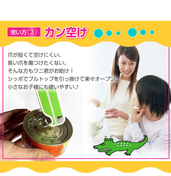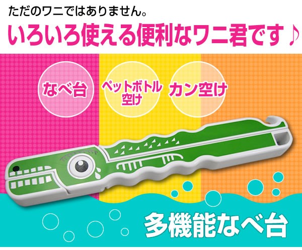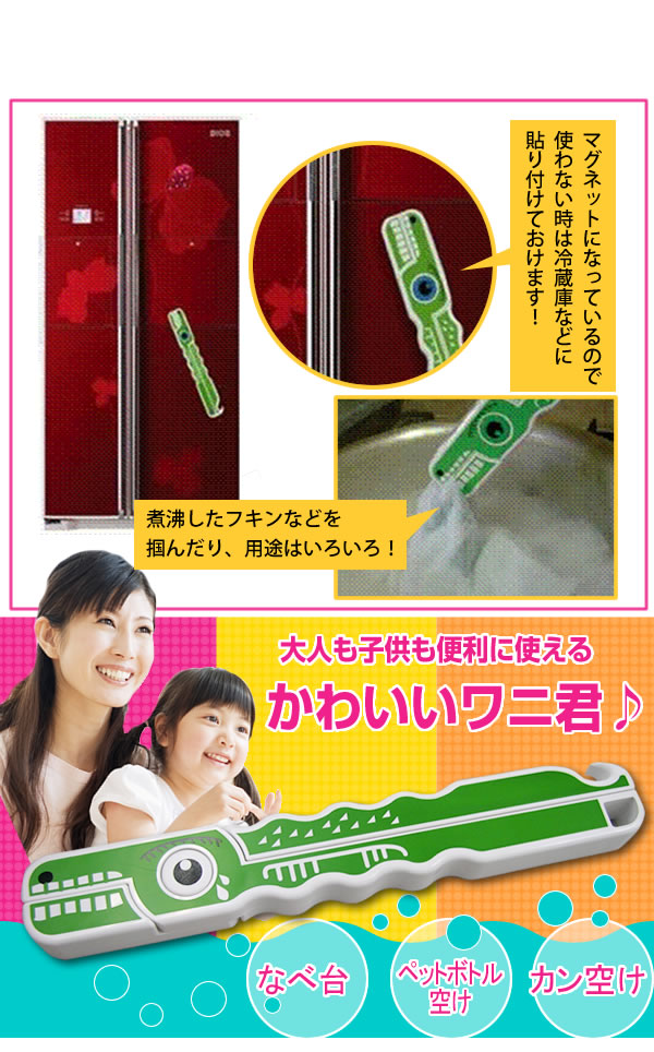 ひとつで「なべ台」「ペットボトル空け」「カン空け」などいろいろ使えるかわいいワニ君!力の弱い女性や子供、お年寄りに便利です。マグネットが付いているので、使わない時は冷蔵庫などに貼り付けておけます♪