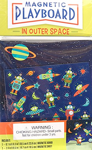 -. Feature : Magnetic playboard measures 8.1 in. x 9.3 in. / The sheet of magnets measures 7.4 in x 6.5 in. / Magnetic playboard has an outerspace scene. / Magnetic sheet includes magnetic martians, robots, stars, planets, and moons to be placed onto the magnetic playboard. / Create loads of space scenes with the moveable magnets.