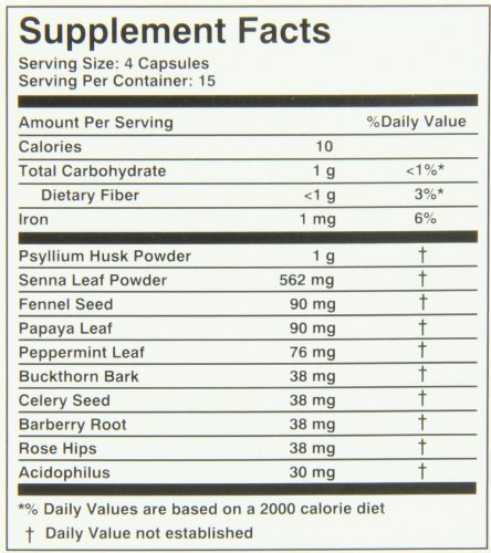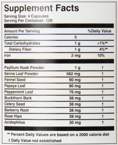 • Along with Senna leaf, Psyllium Husk and Acidophilus Super Colon Cleanse has other essential nourishing herbs; Fennel seed, Papaya leaf, Celery seed, Barberry root and Peppermint leaf. These may have a soothing and relaxing effect on the digest system, which might help with small amounts of discomfort. Buckthorn bark and Rosehips are added to assist with occasional constipation. Together these ingredients work to provide you with a Clean Colon and may provide results you can feel