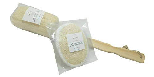 Set of 3, Natural Exfoliating Loofah Luffa Loofa Back Sponge Scrubber Brush with Long Wooden Handle Stick + 2 Loofah Pads Shower Cleaning Brush Body...