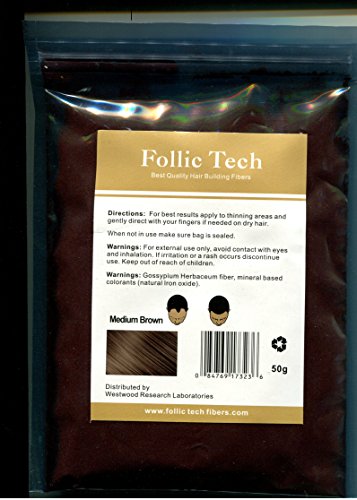 -. Binding : Misc. -. Brand : Follic Tech -. Feature : Natural Gossypium Herbaceum fiber, Natural mineral colorants / Instantly fills in balding and thinning areas for a full look. / Highest quality fibers with a money back guarantee. / Bacteria Free, made in USA not China like other sellers refills sold on Amazon / We do not use animal hair or skin cells like most brands -. IsAdultProduct : 0 -. Label : Westwood reasearch Laboratories -. Manufacturer : Westwood reasearch Laboratories -. Model : UPC -. PackageQuantity : 1 -. ProductGroup : Beauty -. ProductTypeName : BEAUTY -. Publisher : Westwood reasearch Laboratories -. Studio : Westwood reasearch Laboratories -. Title : Number One Rated 100% Vegan Hair Building Fibers Hair Loss Treatment All Natural 52 Gram Refill Bag Follic Tech All Organic