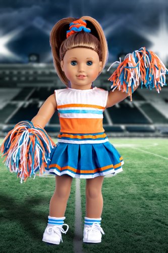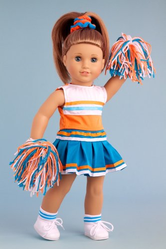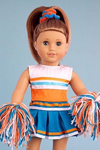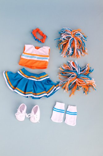 - This complete 6 piece cheerleader outfit includes orange and white blouse, turquoise skirt finished with white and orange ribbon, matching pompons, headpiece, socks and shoes.