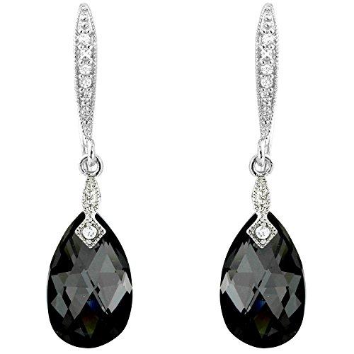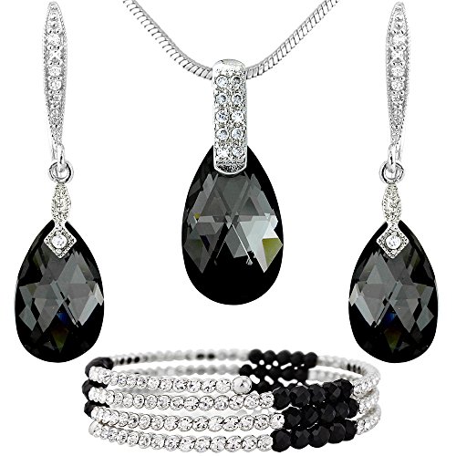 Beautiful tear drop theme black crystal pendant and earrings set made from swaroski CRYSTALLIZEDTM Elements range crystals with contrasting silver tone earring bails and silver tone pendant connectors. Immaculately finished with a silver tone snake pendant chain. Beautifully designed by Crystal Elegance UK. Pendant chain length 40cm approx. Beautiful and elegant tear drop earrings and pendant set. Earrings measure 3.5cm drop down x 1cm (crystal width) approx. Earrings held up by elegant vintage design silver tone crystal studded connectors. Pendant piece measures 2.5cm (drop down) x 1.5cm (approx). Made using swarovski element crystals (for both pendant and earrings). Comes with matching silver crystal and black studded stretch bracelet. (2cm x 17cm approx) to fit all sizes. Very high quality item. For pierced earrings.Feature