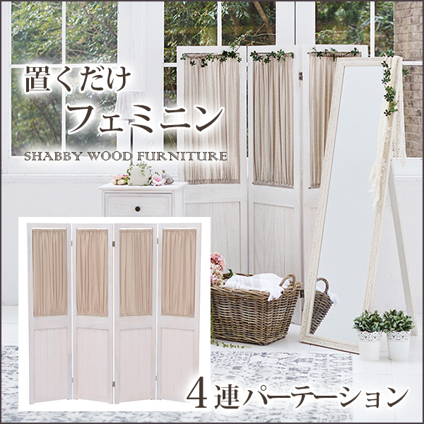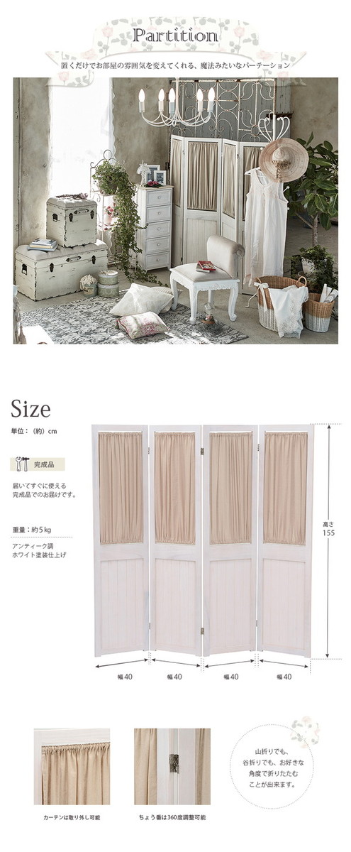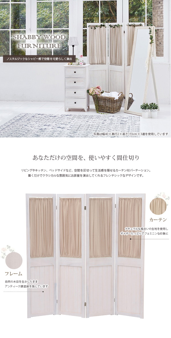 カーテンが取り外し可能なアンティーク調4連パーテーション。お部屋の仕切りや目隠しに!