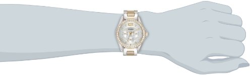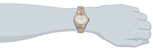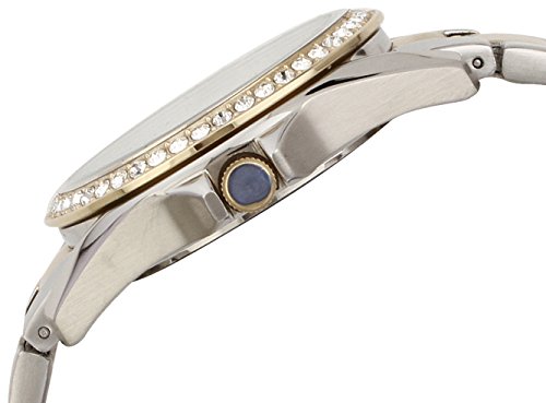 - Feature : Round gold-tone and silver-tone watch with 38 mm stainless steel case and mineral dial window / Analog quartz movement with analog display / Featuring three subdials, luminous hands, white dial, crystal-studded stationary bezel, placed hour markers with crystal embellishments, gold-tone fluted crown, and two-tone stainless steel band with deployant buckle closure / Water resistant to 330 feet (100 m)