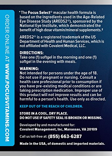 Focus Select is formulated for patients with moderate to advanced Age-Related Macular Degeneration (AMD) directed by their physician to take an AREDS2 supplement. The Focus Select formula utilizes the latest improvements discovered in the National Eye Institute's Age-Related Eye Disease Study (AREDS2), replacing beta-carotene with lutein and zeaxanthin and limiting zinc to the lowest dosage prove effective in the study. Our formulation not only provides powerful levels of the nutrients proven to be beneficial in AREDS2, it is safer for smokers and reduces the risk of side effects associated with higher levels of zinc.Feature