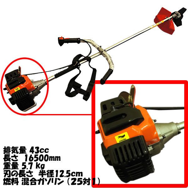 ■排気量:43CC■パワーHI:1.25kw/6000r/min■パワーLOW:2800r/min■刈刃: 26mmx28mm■重量: 約6kg■本体:37x31x24cm■燃料タンク:1250ml(25:1混合油)■作業スタイル
