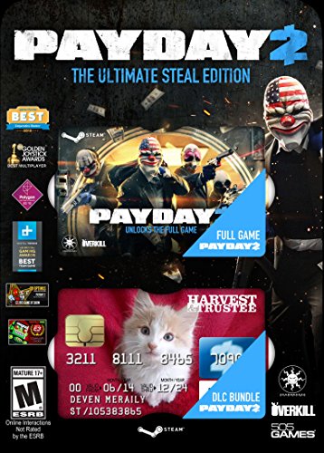 AN ULTIMATE EDITION OF THE PC GAME PACKED WITH SELECT DLC CONTENT @ $39.00 VALUE THE PACK INCLUDES STEAM CODES FOR THE CORE GAME PLUS THE DIGITAL CONTENT ADD ONS PACKAGED AND DESIGNED AS AUTHENTIC PROP CREDIT CARDS FROM THE GAME UNIVERSE HIGHLY LIMITED AND VERY COLLECTIBLE LIMITED EDITION DLC PACKS INCLUDED ARE: THE CHARLIE SANTA HEIST THE DIAMOND STORE HEIST THE INFAMY UPDATE THE DEATH WISH UPDATE THE ELECTION DAY HEIST THE ARMORED TRANSPORT