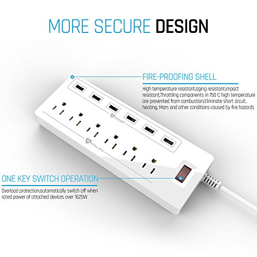 6 USB PORTS with quick charge up to 2.4A for any Samsung Galaxy, iPhone, iPad, iPod, LG, Motorola, Google, HTC, Smartphone and Tablet Devices. 6 current protected Outlets/Sockets for any Electrical Appliance, Computer, Laptop, Printer, Modem, Speaker, Mobile Hotspot, LCD Screen Monitor, Video Game Console, Blu-Ray Players, Apple TV, ROKU, Amazon Fire Stick, etc... and MANY MORE!