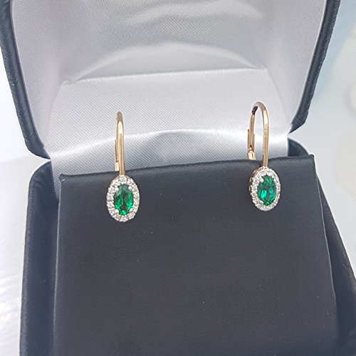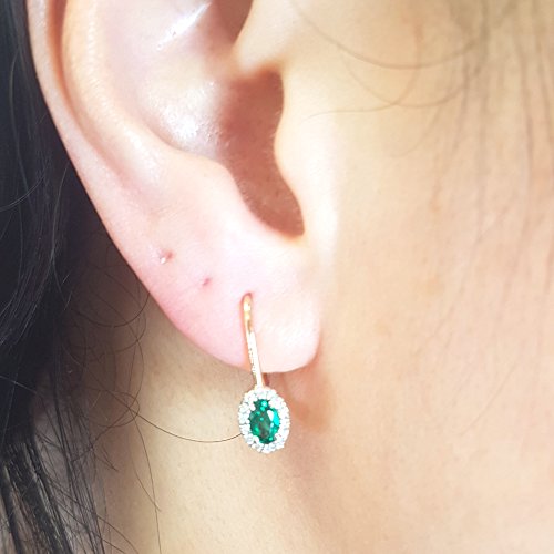 This lovely hoop earrings feature 5X3 MM each oval cut lab created emerald & 0.10 ct. round white diamonds in prong-setting. Only diamonds are sparkling and 100% natural & gemstone are lab created. All diamonds are Natural & non-treated, minimum diamond color is I-J & clarity is I2-I3. All our products with FREE gift box and 100% Satisfaction guarantee. SKU # LC1160-3524-14KRFeature