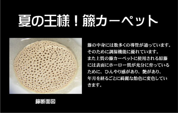 インドネシア原産の5年~7年育成された籐(ロンティ)を使用しているあじろ商品です。夏を快適に過ごす素材として長年重宝されています。6畳編むのに3週間かかる手の込んだあじろ織り独自の編み模様が高級感と涼感をかもしだすます。冷たくしなやかでとても肌触りがよく、籐だけで編んでいますのでとても長く10年以上使用できる逸品です。使い込むほどに綺麗な飴色に変化していきます。