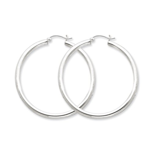 Simple and classic, our rhodium plated sterling silver round hoops feature a snap-tight hinged post and a lightweight hollow tube design that measures 3mm thick.