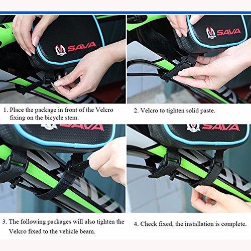 Features: *Anti-fouling and wear resistance material, which is easy to clean. *Excellent waterproof material and design, and all zippers were covered with waterproof PU leather.The best waterproof bike bag for a ride in rainy day. *Special visor design for better operation and easier information scanning on phone even in bright sunlight. *Sensitive cellphone pouch which is made of ultra PVC material screen cover for your easy operating of cellphone. *3 velcro straps provide you a secure and durable riding experience.Your knees won't hit it while riding. Besides, it's easy to install, remove. And it's suitable for a variety of Bicycles(Such as fast *riding, road bike and mountain bike and so on).