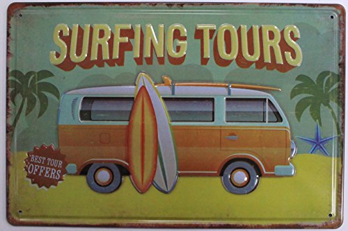 Surfing Tours VW, Beach, Palms and Surfboard Tin Sign Retro Vintage Distressed 8"x12" inches