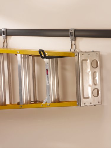 - Feature : Wall-mount hook for ladder storage holds up to 50 pounds. / Powder-coated metal plates help prevent chips and dents. / Heavy-duty hardware fits the garage environment. / Mounts to studs or quickly snaps into place onto FastTrack mounting rails (sold separately). / Made in the USA.