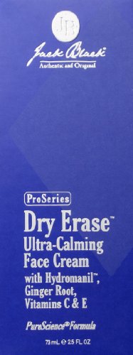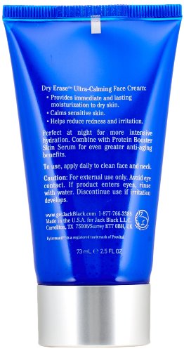 -. Binding : Health and Beauty -. Brand : Jack Black -. Color : no color -. Department : mens -. EAN : 0887868623561 -. Feature : Exclusive formula mimics the structure of natural skin lipids by trapping essential moisture and aiding in the repair and replenishment of the skin's natural protective barrier / Fortified with skin comforters and anti-irritants, it calms irritated skin and helps reduce redness / Contains 10% Aloe Vera Leaf Juice, a natural emollient with hydrating, softening and anti-inflammatory properties / SymRelief, a patented ingredient blend, combats irritation and redness caused by environmental and chemical damage / Rice Bran Extract is super antioxidant that provides soothing and smoothing benefits to skin -. IsAdultProduct : 0 -. Label : Jack Black -. Manufacturer : Jack Black -. Model : 2016 -. MPN : AJB-134 -. NumberOfItems : 1 -. PackageQuantity : 1 -. PartNumber : AJB-134 -. ProductGroup : Prestige Beauty -. ProductTypeName : BEAUTY -. Publisher : Jack Black -. ReleaseDate : 2013-10-05 -. Size : 2.5 oz -. Studio : Jack Black -. Title : Jack Black Dry Erase Ultra-Calming Face Cream, 2.5 fl. oz. -. UPC : 885504820350