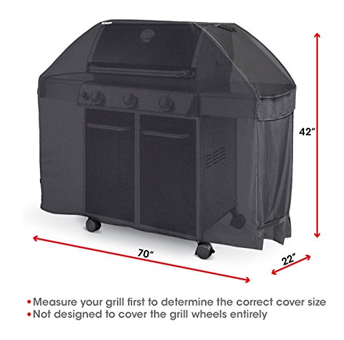 -. Feature : Tear resistant fabric with PVC coating material construction,all weather protection for your grill against snow,rain,hail,wind,dust and dirt,etc / Structured hiding mesh vents at both sides for air circulation to let moisture escape and protect your grill from mildew / Handles at two sides for easy fitting,removal and hanging / Easy to fasten velcro closure straps at both ends to prevent cover from slipping or blowing off / Measures 70" width by 22" depth and 42" height. Be sure to measure your grill first to determine the correct cover size.