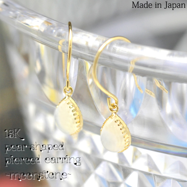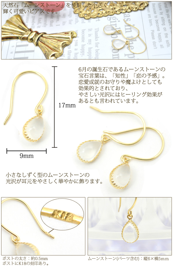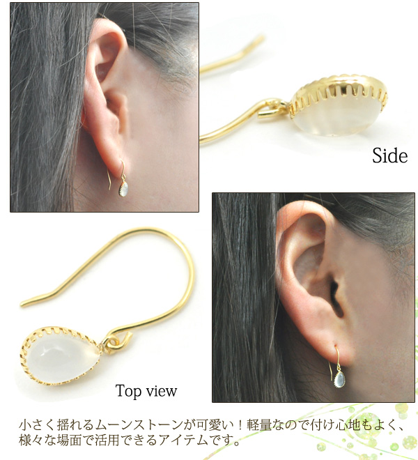 小さなペアシェイプ(しずく型)のムーンストーンの光沢が耳元をやさしく華やかに飾ります。