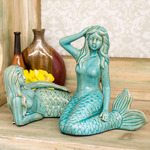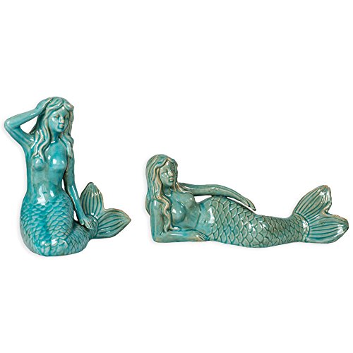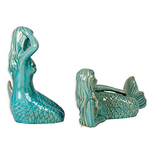 Set of 2 Aqua Ceramic Painted Mermaid Figurines