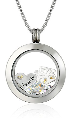 Stainless steel round pendant necklace featuring transparent locket center with loose crystals and engraved "Family" heart and tree-house charms