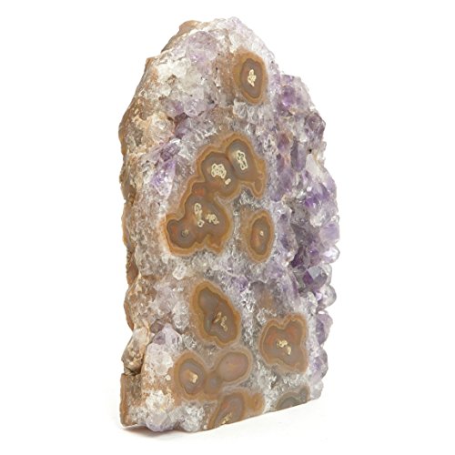 One-of-kind: Your new crystal is an Amethyst Eyes cluster from Artigas, Uruguay. Amethyst is the prized purple form of Quartz, naturally colored by Iron minerals. This is a rocky brown stone with translucent purple Amethyst crystals and banded brown Stalactite formations that look like eyes or flowers.