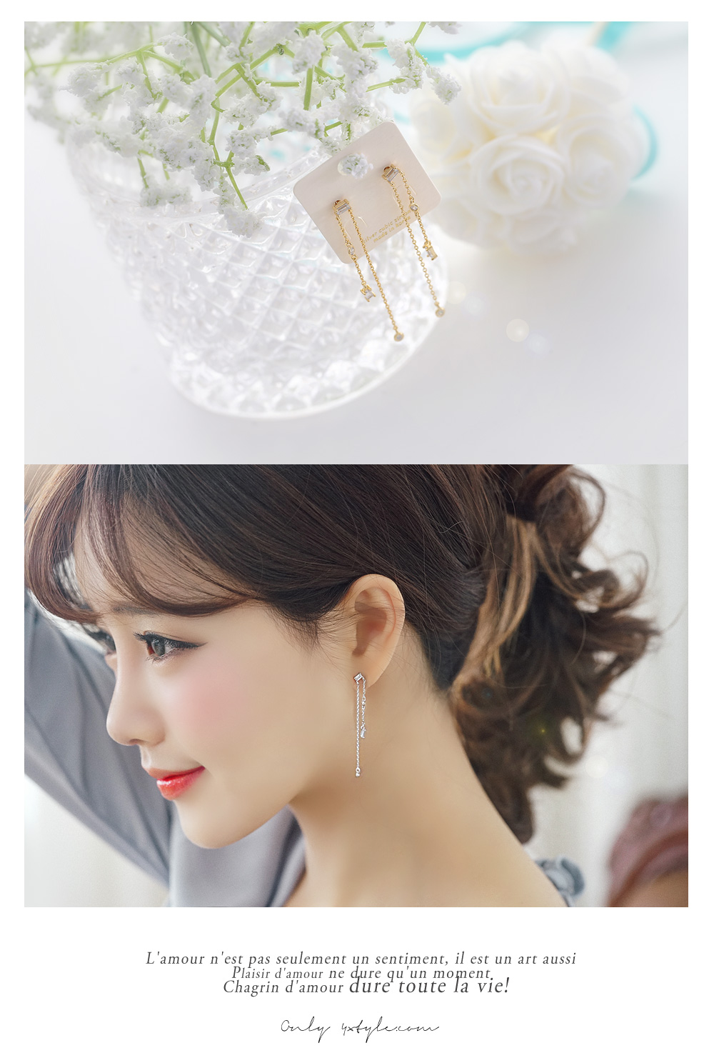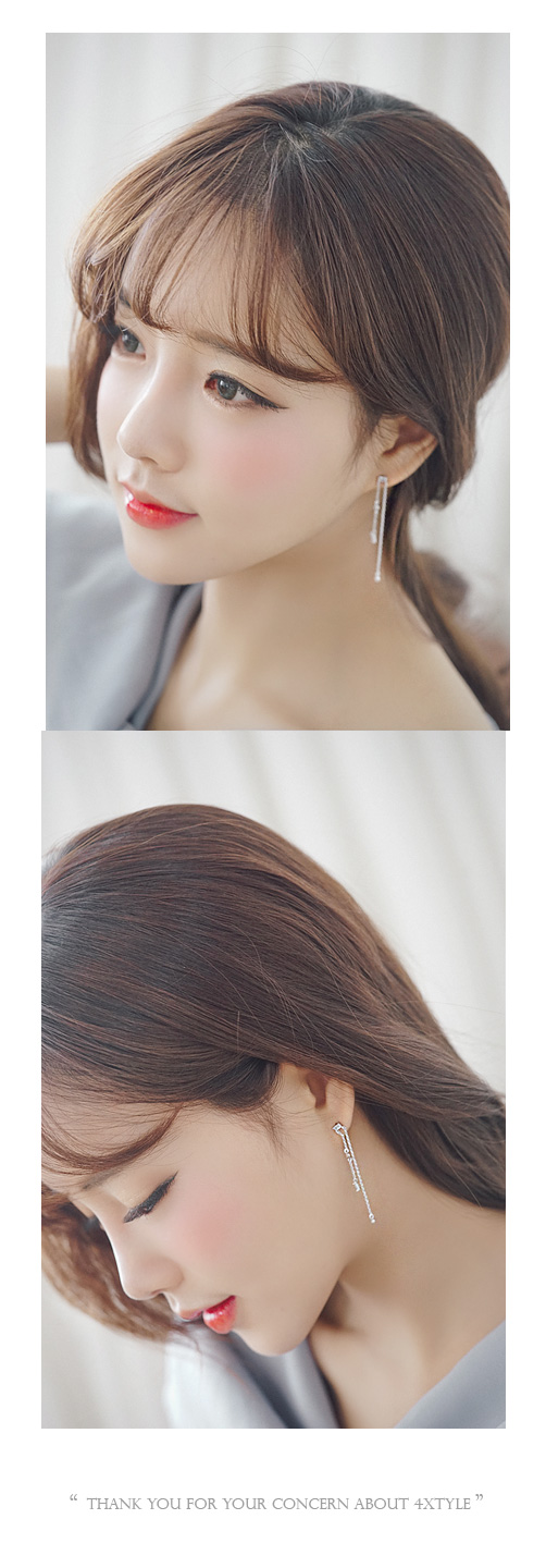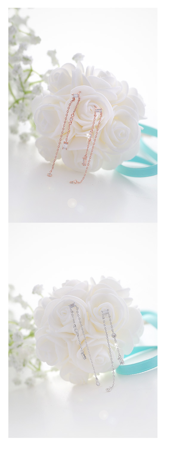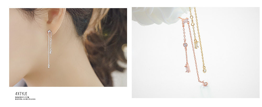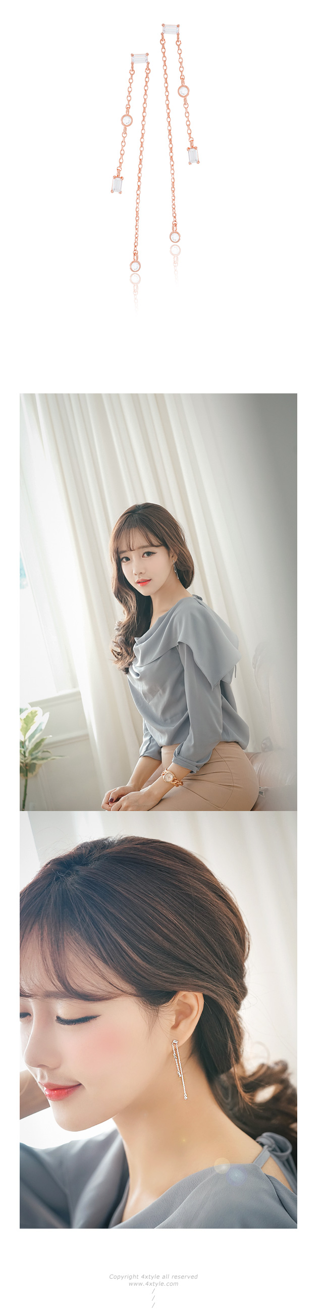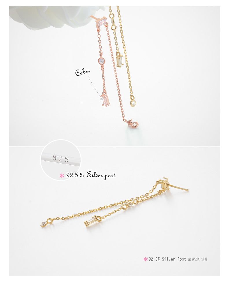 스퀘어 크리스탈 아래로 언발란스하게 뻗은 2개의 체인 이 우아한 쉐입의 쉘 위 키스 귀걸이입니다.
