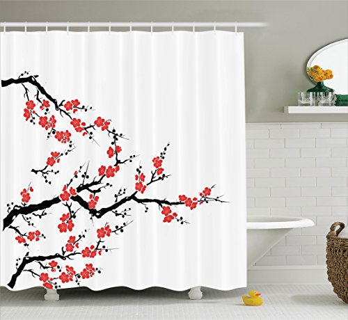 Ambesonne Japanese Decor Collection, Simplistic Cherry Blossom Tree Asian Botanic Themed Pattern Fresh Organic Lines Art Work, Polyester Fabric Bathroom Shower Curtain, 75 Inches Long, Red Black