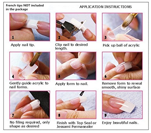 Specifications: Brand Name: Nadeco Material: High Quality ABS Imported from Korea Application: Finger Nail Pre-Designed: Yes Quantity: 41/42 pcs per set Size: 12 sizes Cover Type: Full Cover Certification: SGS APPLY IN MINUTES: 1.Prepare Acrylic Powder and Liquid 2.Pick up ball of Acrylic (first Liquid then Powder with Acrylic Pen= ball of Acrylic) 3.Gently guide acrylic to nail forms 4.Remove form to re veal smooth, shiny surface 5.No filling required, only shape as desired 6.Finish with Top Seal or Jessami Permasealer 0