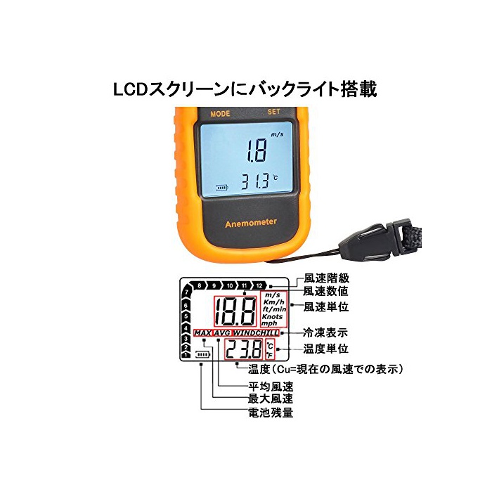 LCD스크린으로 백 라이트 탑재에,어두운 곳이나 야간에서도 확인 가능합니다.풍속과 온도를 동시에 표시하는 것 를 할 수 있습니다.성에너지의 디자인에 의해정지 상태에서의 자동 전원OFF,백 라이트 자동 소등 입니다.