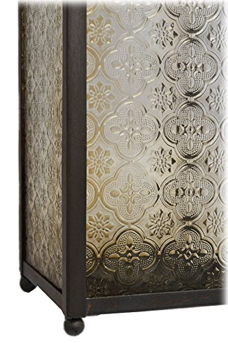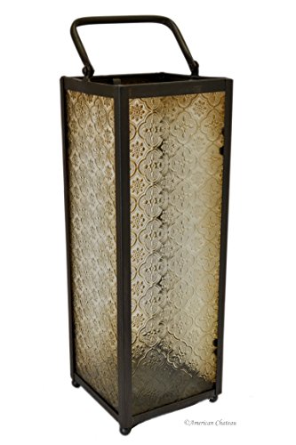 -. Feature : Moroccan Style Lantern / Bronze Color Metal / Smokey Amber and Clear Antique Style Glass / Handle for Easy Transport / Approximate Size: 15.5 inches x 5.3 inches x 5.3 inches