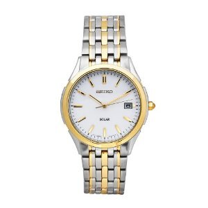 세이코의 SNE136P1의 남자용 화장실의 태양의 워치는,날짜 윈도우,도금 한 2개의 컨디션 금의 중의세트고, 및 스테인레스강의 경우 및 팔찌를 구비했(갖췄) 흰 다이얼 를 가지고 있습니다.