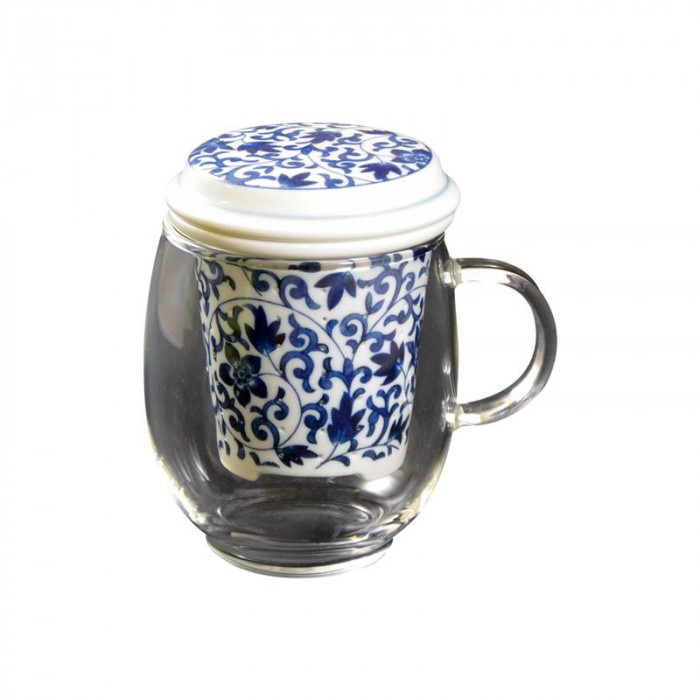 ガラスのマグカップに陶磁器の茶こしと蓋をセットしました。茶こしは底部が三つ脚になっており、マグカップに茶こしの脚を引っ掛け、熱いお茶の湯切りをすることができます。蓋は裏返すと茶こし受けとしてもご使用いただけます。ギフトにも最適♪ |