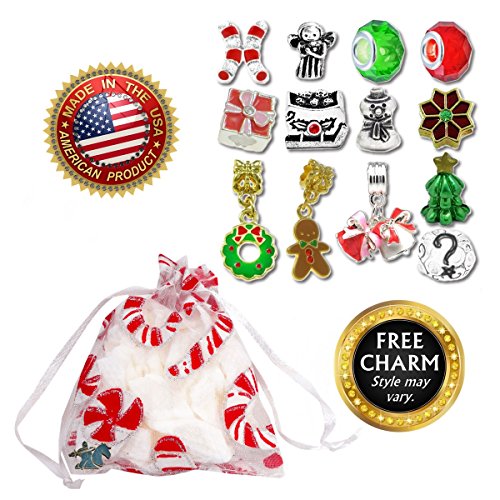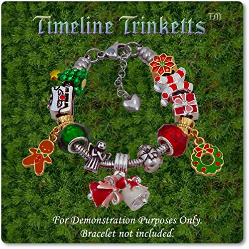 - THE MOST POPULAR holiday spacers! 12 pack exactly like those pictured and no duplicates. Red and green faceted glass, white sparkle enamel candy cane, angel, dark and light wrapped present with rhinestone, sleigh with packages, snowman, gold poinsettia with peridot center, wreath pendant, gingerbread man dangle, ivory and pearl pink bells with clappers that actually move, and a tree with gold star topper. Create a unique and beautiful Merry Xmas party charm bracelet accessory.