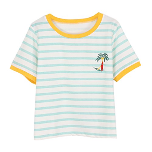 -. Title : (ライチ) Lychee レディース ボーダー柄 Tシャツ かわいい ココナッツツリー刺繍入り クルーネック 半袖 大きいサイズ ゆったり カジュアル 森ガール