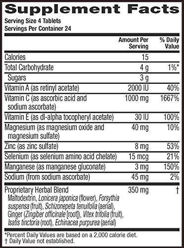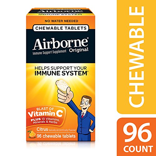 Airborne Chewable Tablets provides immune support in a great-tasting and easy-to-take form; no water needed. Each serving (4 tablets) delivers a blast of 1000 mg of Vitamin C and 13 vitamins, minerals, and herbs, including Echinacea, and ginger.* Same immune support found in Airborne Effervescent Tablets and Gummies. Gluten Free. Visit AirborneHealth.com to learn more. *These Statements have not been evaluated by the Food and Drug Administration. This product is not intended to diagnose, treat, cure or prevent any disease.Feature