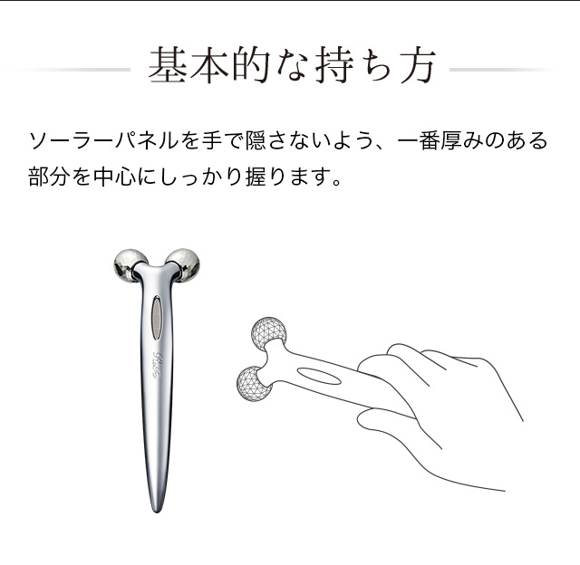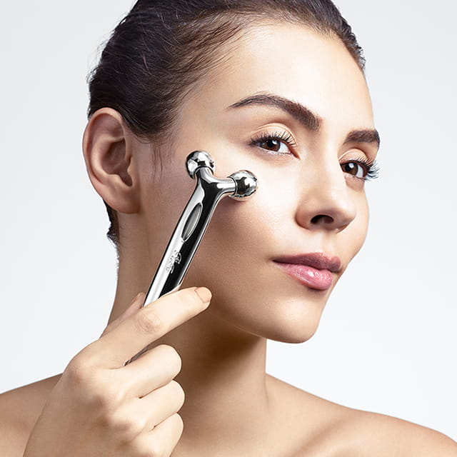 目元、口元のゆるみがちな肌へ、「やさしくつまみ流す」ポイントニーディング プラチナの輝き、華奢なラインの先端に配したのは、顔の細やかな起伏にもフィットする360°マルチアングル構造のローラー。